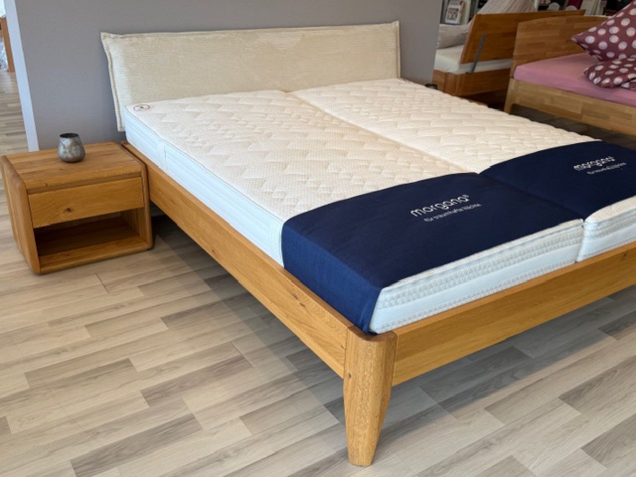 Wir bieten hier ein hochwertiges Massivholzbettgestell aus unserer Flowline-Kollektion der Firma Hasena - Farbe: Eiche bright - inclusive 2 Nachttische Curvino